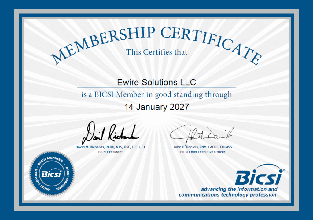 That’s why Ewire Solutions is proud to be a BICSI Certified Member. BICSI (Building Industry Consulting Service International) is the global authority that sets the standards for information and communications technology (ICT), including structured cabling, network infrastructure, security systems, and smart building solutions.