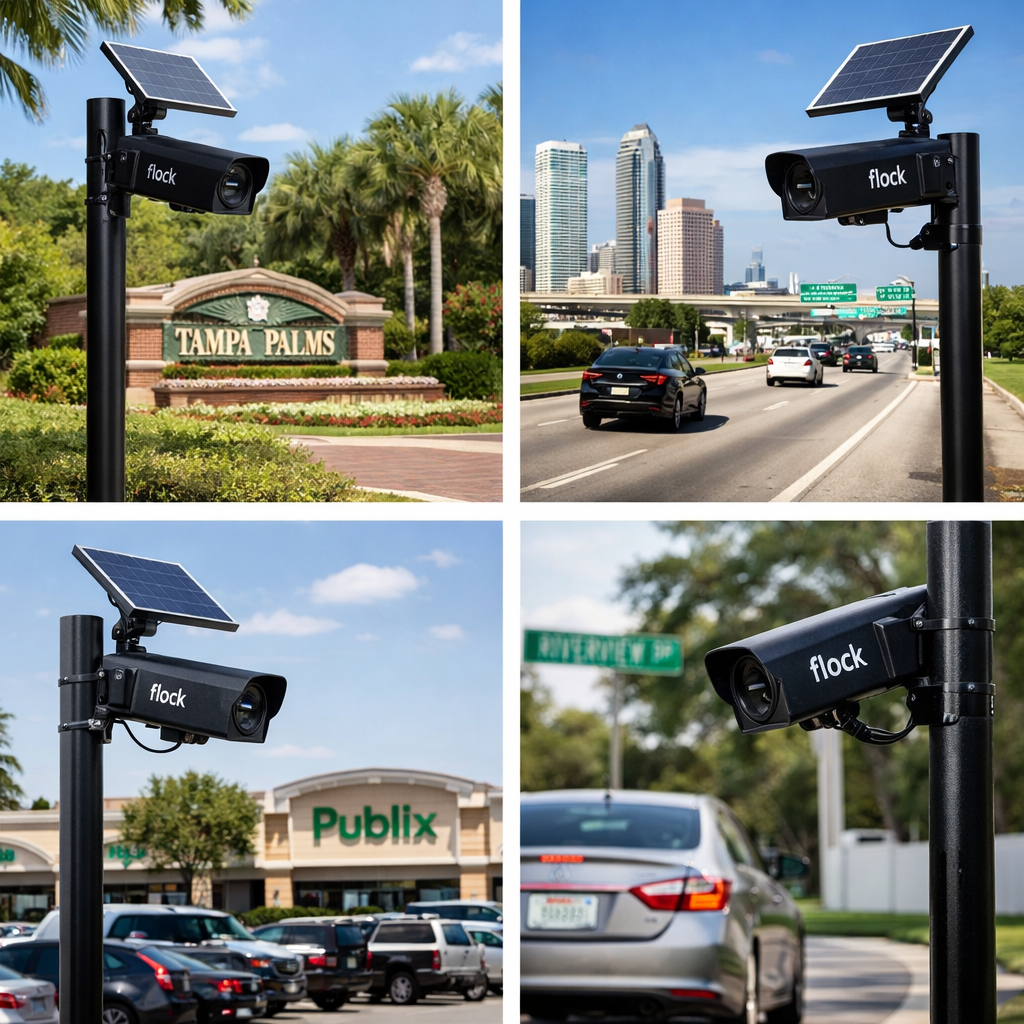 Flock Safety license plate recognition cameras are becoming more common throughout the Tampa Bay area, appearing in residential communities, apartment complexes, shopping centers, and along local roadways.